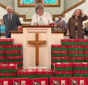 Susan Clements gladly announces a record-breaking 500 Operation Christmas Child boxes donated by members and friends of Cowan FBC this year. The previous record was 328 boxes gathered in 2024. Susan and her husband Judd spearhead the Operation Christmas Child effort every year.